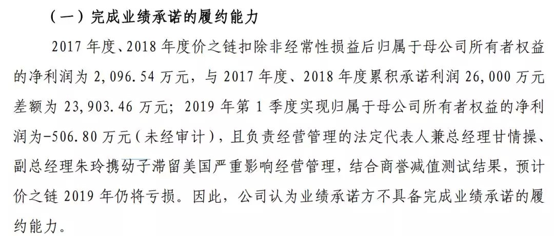 浔兴股份在去年10月9日公告中指出,价之链2017年净利润9686.96万元,未完成业绩承诺;2018年上半年发生重大亏损,净利润-1907.58万元,且经营状况持续恶化,所承诺的业绩已不可能实现。