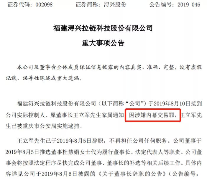 8月11日,浔兴股份发布公告,公司于8月10日接到公司实际控制人、原董事长王立军家属通知,因涉嫌内幕交易罪,王立军已被重庆市公安局实施逮捕。目前,公司生产经营正常有序,公司董事会正审慎评估该事件对公司各方面的影响,并采取及时有效措施,确保生产经营稳定。