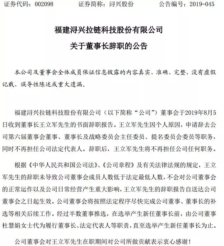 当时公司发公告称,于2019年8月5日收到董事长王立军先生的书面辞职报告。王立军先生因个人原因,申请辞去公司第六届董事会董事、董事长及战略委员会主任委员、提名委员会委员等职务,同时不再担任公司法定代表人。辞职后,王立军先生将不再担任公司任何职务。