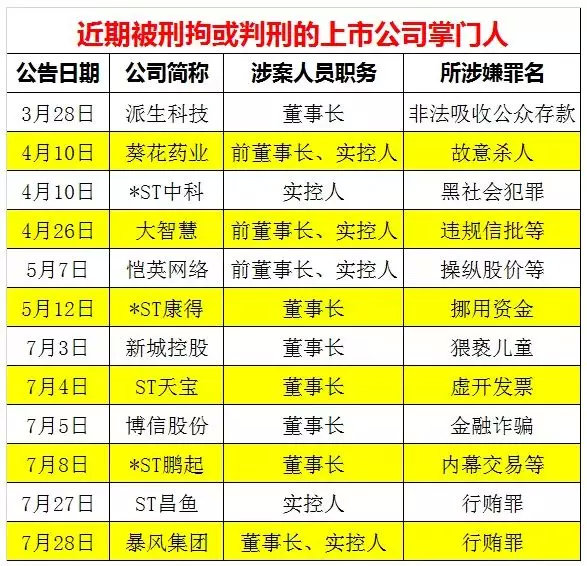 根据基金君之前统计,短短四个月时间里,A股市场董事长或实际控制人被抓的已经超过十几人,A股董事长上演大片“监狱风云”。