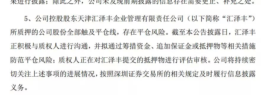 王立军持有的浔兴股份累计质押占其持股比例达100%,依然在全数质押中,浔兴股份在5月22日的公告中表示,公司控股股东汇泽丰所质押的公司股份全部触及平仓线,存在平仓风险。