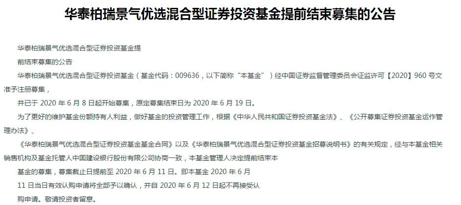 6月10日,华泰柏瑞基金公告,华泰柏瑞景气优选宣布提前结束募集,据渠道人士透露,仅四天该基金募集规模便超过50亿元。