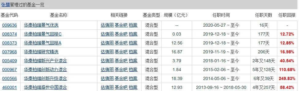 Choice 统计数据显示,截至6月11日,张慧于2014年5月起管理的华泰柏瑞创新升级混合型回报达249.83%;2015年2月起开始管理的华泰柏瑞创新动力灵活配置混合型基金的回报达110.68%。