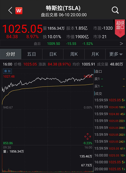 美东时间6月10日,特斯拉股价大涨,盘中一度涨超7%,并快速突破1000美元。截至当日收盘,特斯拉收涨8.97%,收报1025.05美元,市值超1900亿。