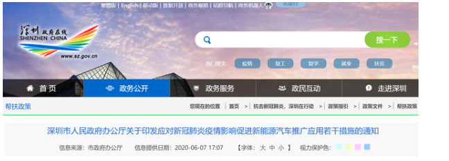 6月7日,深圳市印发《深圳市应对新冠肺炎疫情影响促进新能源汽车推广应用若干措施》(以下简称《措施》),文件从五大方面采取措施促新能源汽车产业发展,自2020年6月7日起执行,至2020年12月31日止。