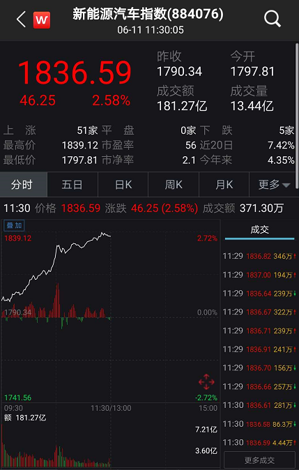 除了特斯拉概念之外,A股新能源汽车板块也出现了放量大涨的行情。6月11日上午,新能源汽车板块超百只个股飘红,多只新能源汽车概念股涨停。