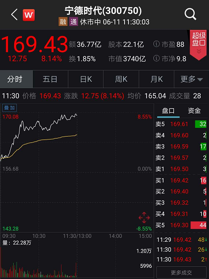 6月11日上午,宁德时代股价快速上攻,一度涨超8%, 市值就狂飙了超280亿,并突破3700亿。