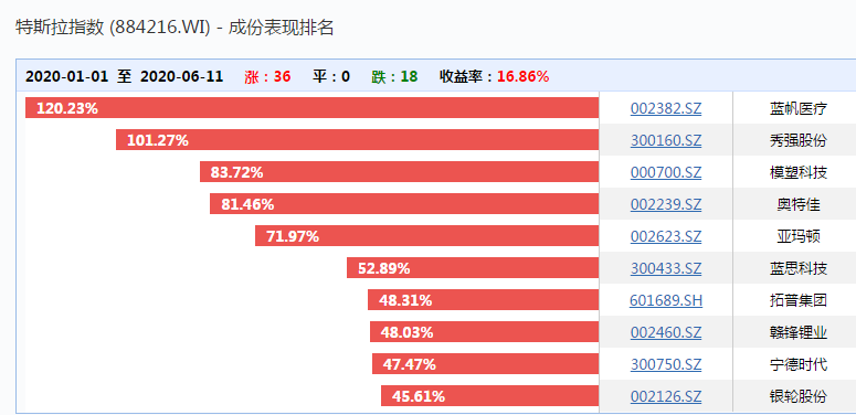 从今年特斯拉板块的表现看,特斯拉指数年内涨幅已经超20%以上,其中超3只个股涨幅超100%,股价快速翻倍,这也意味着,特斯拉相关的产业链公司集体受益,市值大涨。