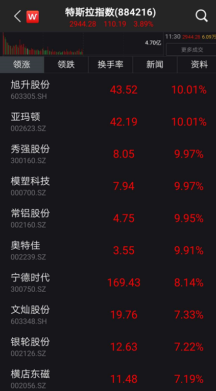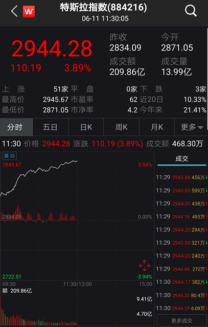 6月11日上午开盘,特斯拉指数高开高走,指数迅速上冲,涨幅快速突破3%以上。截至午盘收盘,特斯拉指数涨超3.89%,短短半日,板块市值飙升超450亿,成交金额200亿元。