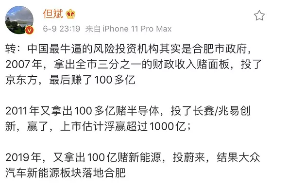 日前,私募大佬但斌在微博转了一条段子称,中国最牛逼的风险投资机构其实是合肥市政府,2007年,拿出全市三分之一的财政收入赌面板,投了京东方,最后赚了100多亿2011年又拿出100多亿赌半导体,投了长鑫/兆易创新,赢了,上市估计浮赢超过1000亿。