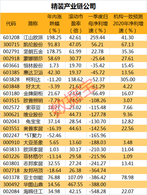 从机构预测的2020年净利增速看,柯利达净利增速最高,达305%,亚士创能和凯伦股份预计增速分别为79%和67%,江山欧派、坚朗五金、蒙娜丽莎、奥普家居和海鸥住工净利增速均在20%以上。