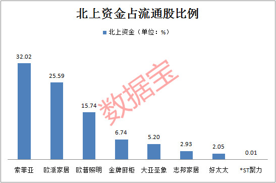 索菲亚主要经营定制衣柜及全屋配套定制家具,最受外资青睐,近日更是因为外资(QFII/RQFII/深股通投资者)的持股比例超过26%,而触及外资持股比例预警线。另外,北上资金也青睐欧派家居,占流通股比例超25%,获北上资金高比例持股的还有欧普照明、金牌厨柜、大亚圣象等。