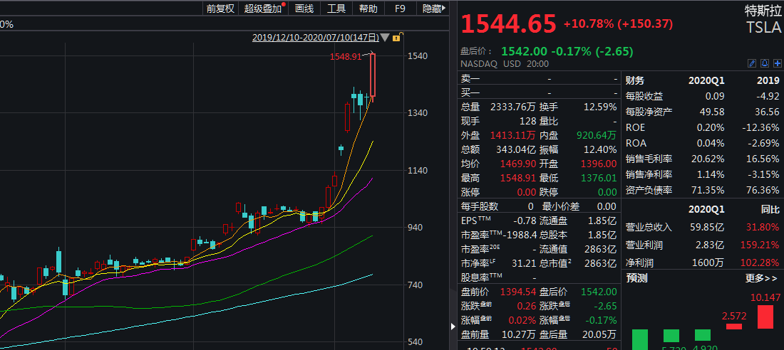 另外,特斯拉股价上周五收盘大涨10.78%,股价突破1500美元至1544.65美元,续创历史新高,市值近2900亿美元。4月初至今,特斯拉股价快速飙升,股价从500美元一线涨至1500美元上方,短短3个月涨幅超过300%。