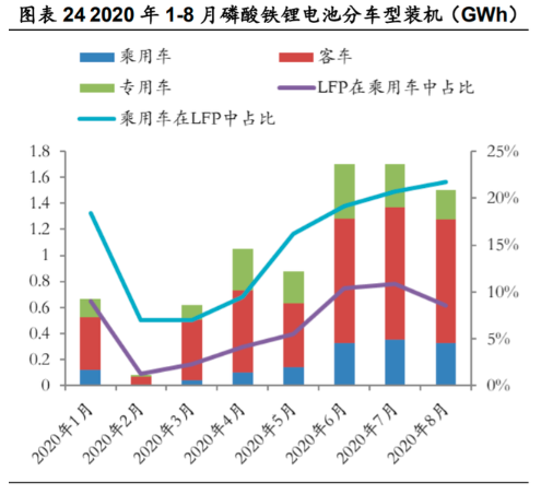 值得注意的是,今年以来磷酸铁锂动力电池装机占比回升,乘用车占比提升显著