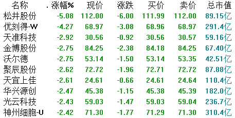 跌幅方面,松井股份跌逾5%,优刻得(688158.SH)跌逾4%,天准科技(688003.SH)、金博股份(688598.SH)等跟跌。