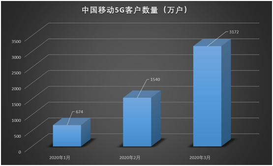 4月20日,中国移动发布的2020年第一季度财报显示,3月底中国移动5G套餐客户数累计达到3172.3万户,1月底仅673.6万户,相比2个月前大增近5倍。5G套餐客户指订购5G资费套餐的个人移动电话客户,不包含未订购5G套餐、仅共享5G套餐资源的客户。