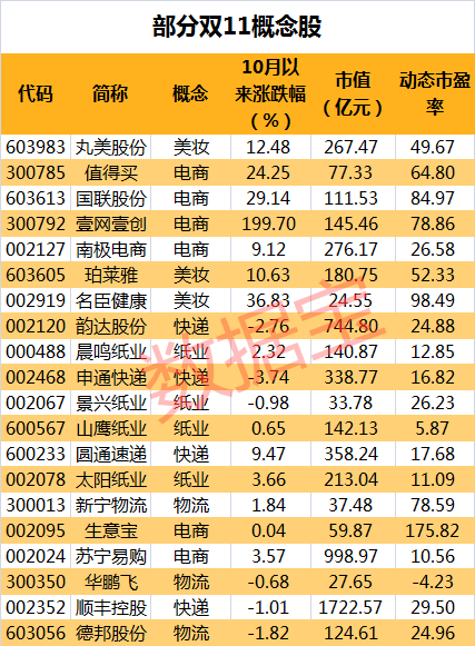 电商服务类公司壹网壹创、美妆类公司丸美股份、珀莱雅等双11概念股股价昨日创下历史新高。