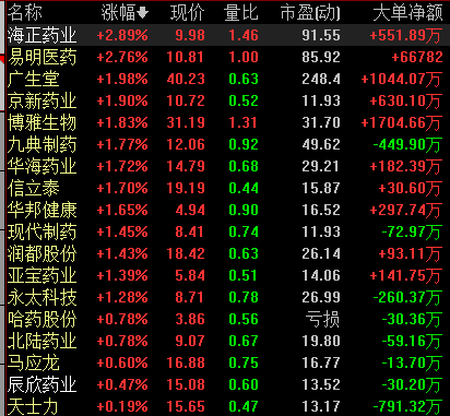 周三尾盘,受利好消息刺激,仿制药概念股尾盘异动拉升。截至收盘,海正药业、易明医药涨近3%,广生堂、京新药业、华海药业、九典制药等纷纷跟涨。