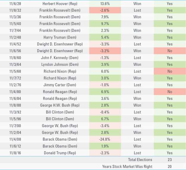 LPL Financial高级市场策略师迪特里克(Ryan Detrick)在报告中指出,自1984年以来,股市一直正确预测谁将赢得美国总统大选,即使追溯到1928年,标普500指数表现的预测成功率也高达87%。“当标普500指数在大选前3个月上涨时,执政党通常会获胜,而当股市走低时,往往意味着一个新政府将会出现。比如在2016年,除了股市,很少有人预测到特朗普能击败希拉里·克林顿。”德特里克称。