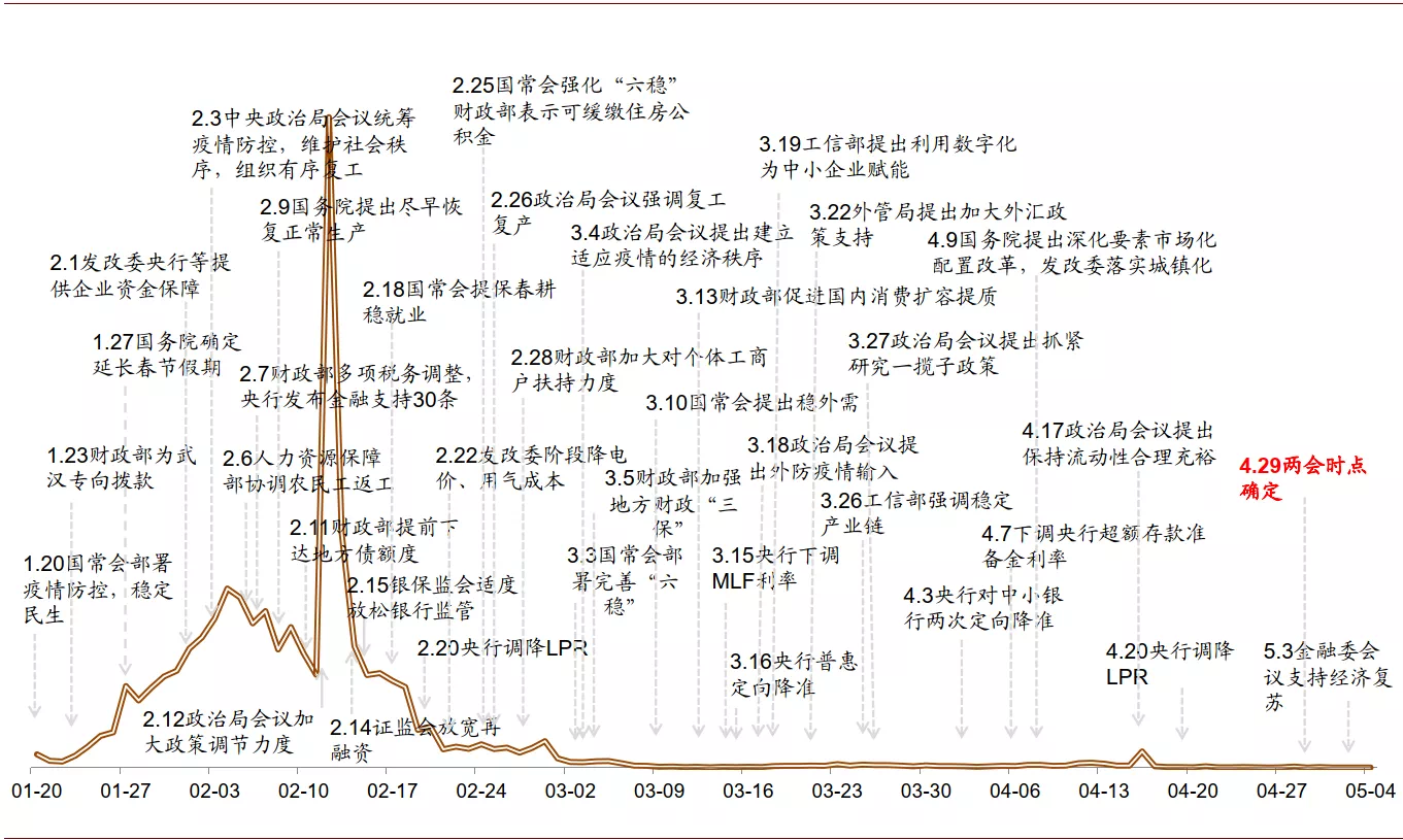 虽然目前国内疫情已经得到控制,但海外疫情仍在蔓延,截至5月5日全球确诊病例已经超过350万例。外防输入压力仍大,且需要防范今年秋冬季的“二次暴发”风险。我们预计“重大疫情防控”、疫情防控常态化下如何谋求发展可能成为核心议题之一。不久前召开的政协主席会议提出将就该议题“建真言、谋良策”。