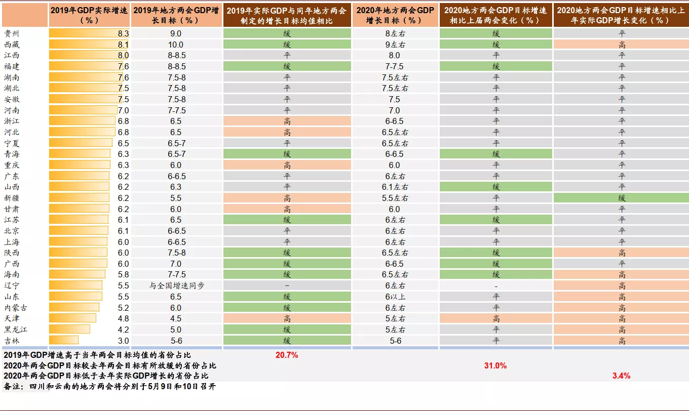 2020年地方政府制定的GDP目标以及与2019年对比