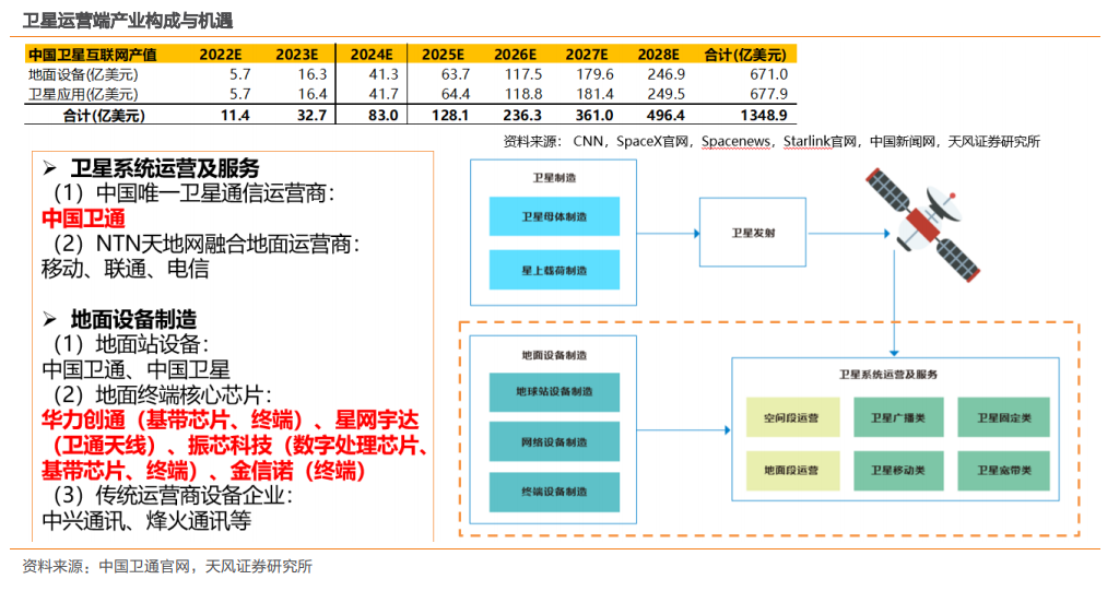 (3)远期更大空间一卫星互联网应用与地面设备:主核心一运营龙头中国卫通,后期地面设备配套:华力创通(基带芯片)、星网宇达(卫通天线及动中通模块)、金信诺(终端).