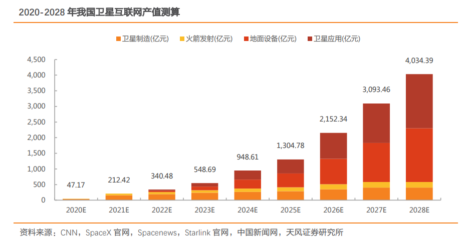 天风证券认为,我国卫星互联网年产值将有望于2028年达到0.4万亿元人民币,其中卫星制造年产值403.62亿元,火箭发射年产值180.7亿元,地面设备1716.1亿元,卫星应用1733.9亿元。