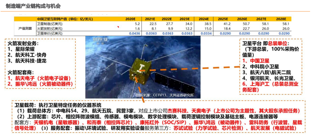星座组建制造先行:制造龙头一中国卫星;核心配套企业(天银机电(星敏感器龙头)、和而泰(星载射频芯片三供方中唯一民企)、康拓红外(soc\SlP )、雷科防务(行波管、星载信号处理)、振华科技\鸿远电子(被动器件)。