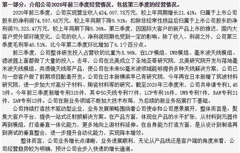 信维通信介绍,公司定位全球领先的一站式泛射频解决方案提供商,积极布局LCP(液晶聚合物材料)模组、UWB(超宽带无线通信技术)模组、毫米波天线模组、滤波器等,2020年前三季度新增专利315件,其中5G天线专利77件,LCP专利16件,UWB专利7件,BAW(体声波)专利21件,SAW(表面声波)专利12件。