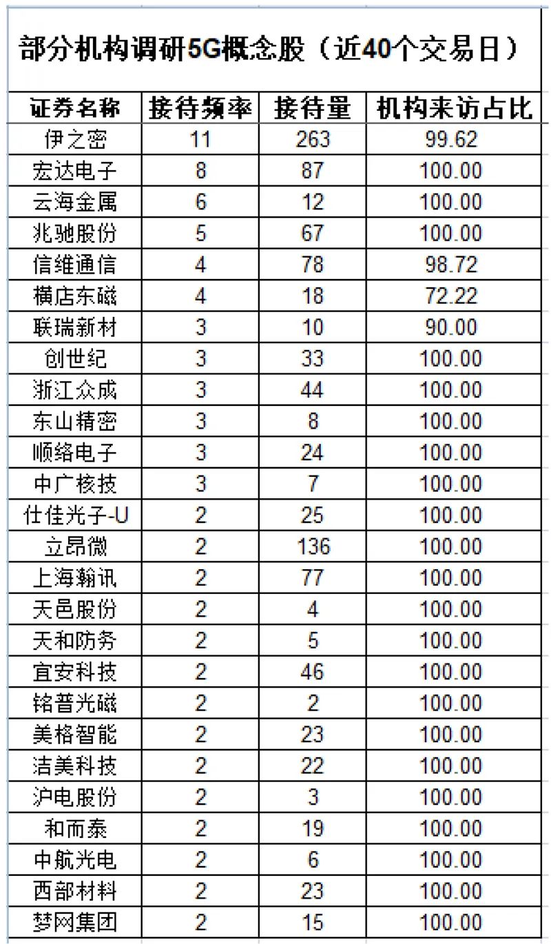 其实,机构对于5G概念股早已悄然做“功课”。上证报记者查阅机构调研记录发现,近40个交易日以来,伊之密、宏达电子、云海金属、兆驰股份、信维通信、横店东磁等多只5G概念股被机构密集调研。