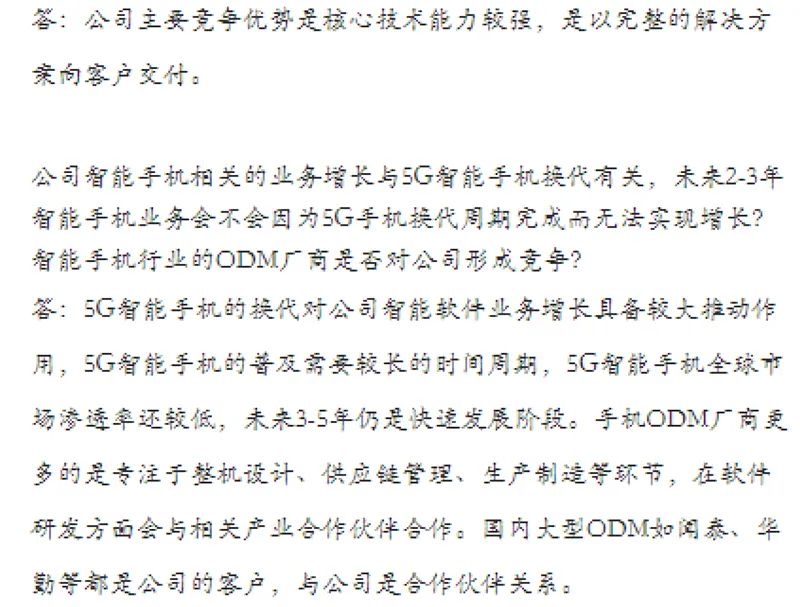 中科创达披露,公司从2017年华为麒麟970芯片开始,与华为在芯片、T-BOX、LiteOS、鸿蒙OS以及智能座舱领域,一直保持非常紧密的合作;公司运用多年积累的产品与技术和华为共同面向车厂,让车厂能够更快、更好、更经济地推出智能汽车产品。中科创达认为,5G智能手机全球市场渗透率还较低,未来3-5年仍是快速发展阶段,随着5G的超低延时、超高可靠技术的落地,AR/VR设备的出货量会快速增长。