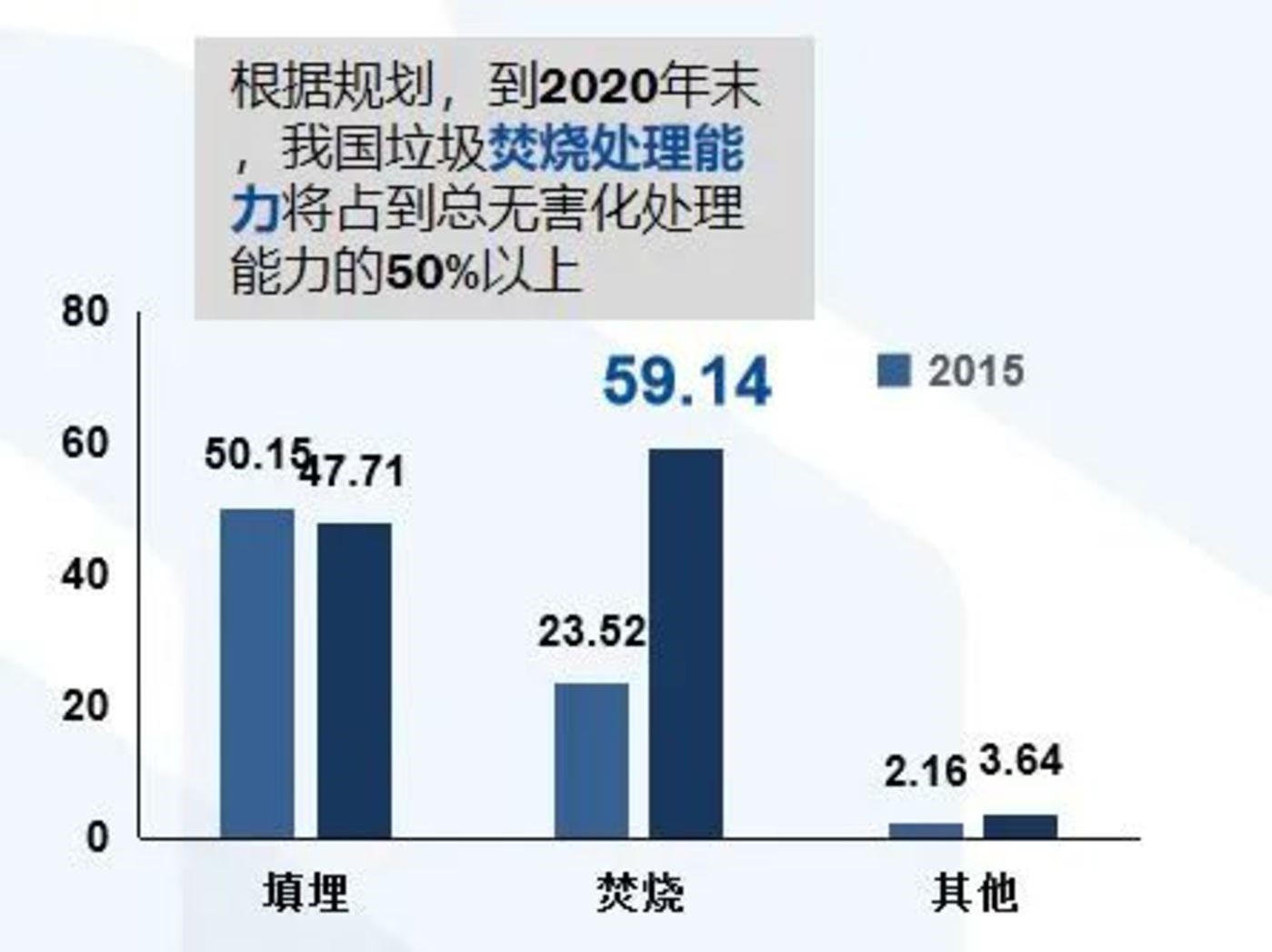 根据十三五规划,到2020年末,我国垃圾焚烧处理能力将占到总无害化处理能力的50%以上。