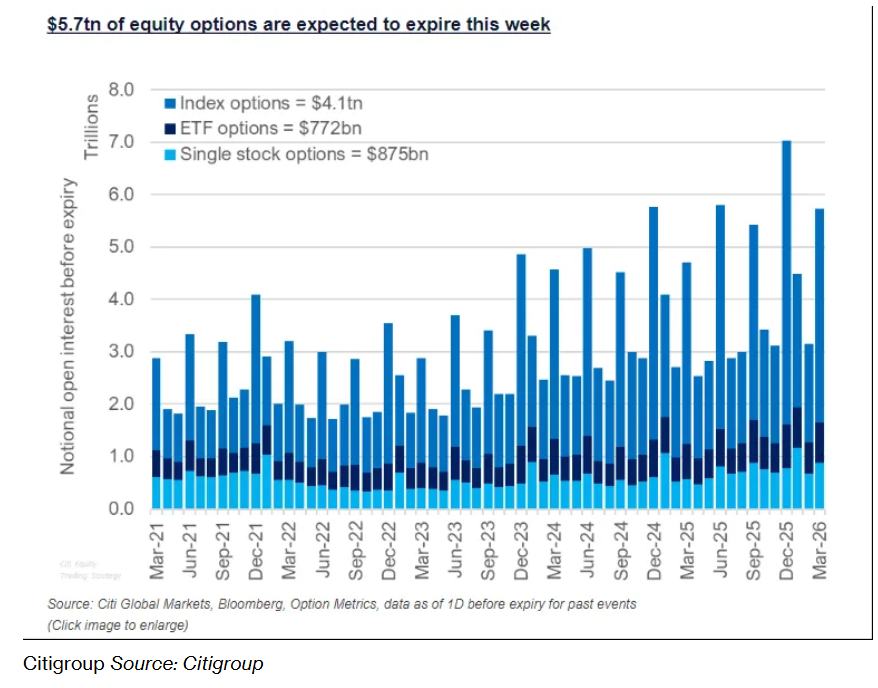 根据花旗集团可追溯至1996年的数据,周五将有大约5.7万亿美元名义价值、与美国个股、指数和交易所交易基金挂钩的期权到期——也将是历年来规模最庞大的3月到期价值,这一季度性事件长期以来被交易员们称为“四巫日”,不过现在叫“三巫日”更符合现状。该项名义期权到期数字包括4.1万亿美元的指数合约、7720亿美元的交易所交易基金合约以及8750亿美元的单一个股期权。