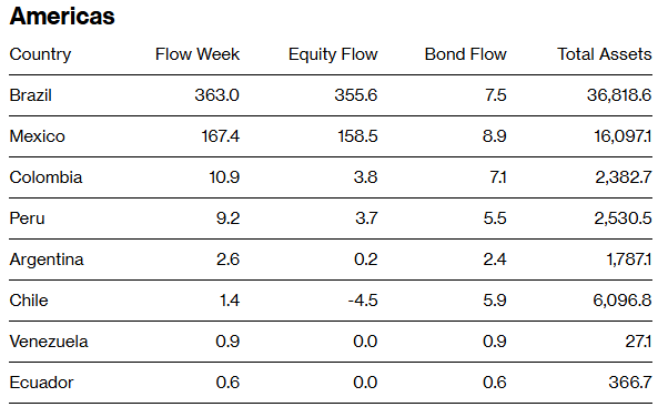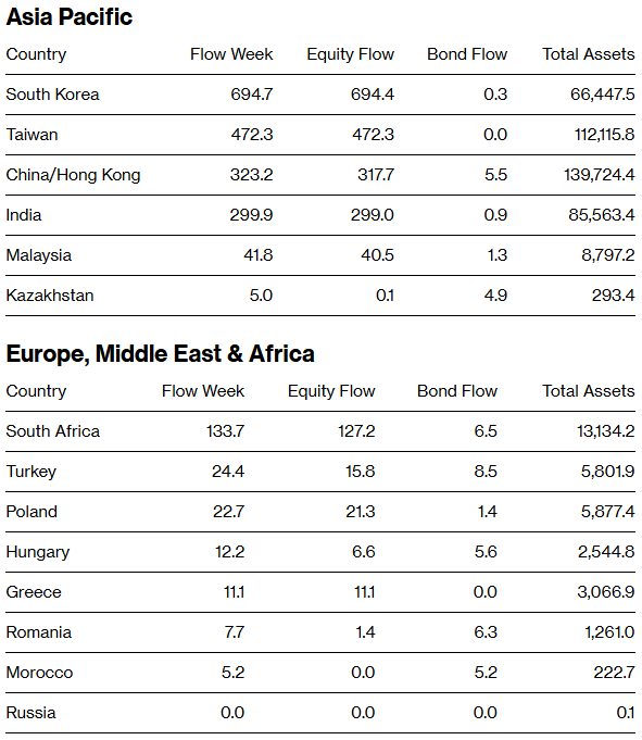 * 流入榜首:韩国(+6.947亿美元,主要由iShares安硕MSCI韩国ETF带动)