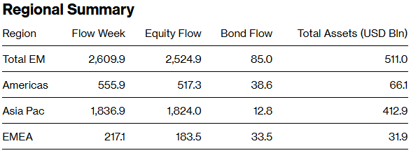 以以美元计价的新兴市场ETF资金流动情况如下。数据包含跨国家基金按持仓权重分配的部分以及针对特定国家的基金。最新及历史流量均采用最新的基金权重进行分配(除非另有说明,单位:百万美元)。