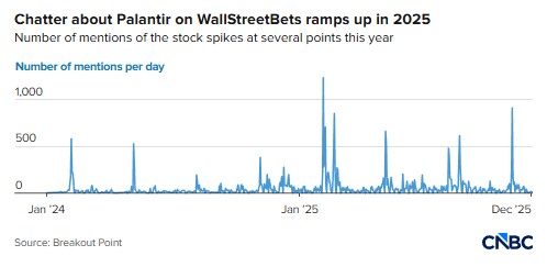 这只股票也成为Reddit热门论坛WallStreetBets上的焦点。根据“迷因股”追踪公司Breakout Point的数据,在2025年的多个交易日中,Palantir是该论坛提及次数最多的股票。