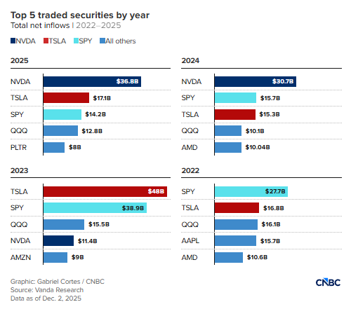 Vanda的数据显示,Palantir有望成为今年净买入金额排名第五的证券,仅次于特斯拉(TSLA.US)、英伟达(NVDA.US)等超大市值股票,以及追踪整个美国股市基准的SPDR标普500ETF(SPY)等热门交易型基金。