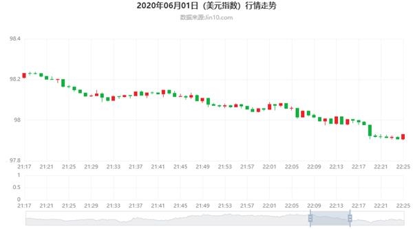 然而,数据出炉后美元指数不涨反跌;在随后的一个小时内,美元指数持续走低。到晚上22:45,美元指数触及97.86的低位。