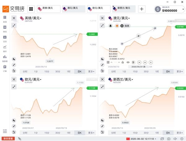 在美国爆发抗议活动之际,欧洲多国、日本等国家疫情得到有效控制,并且已经陆续展开重启经济和新一轮经济刺激计划的进程,经济复苏在望。在乐观情绪推升下,如下图所示,英镑、欧元、澳元和纽元兑美元汇率在逐步走高。