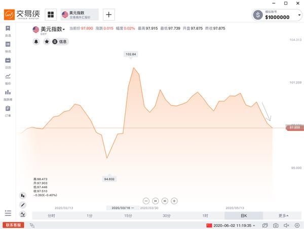 周二,美元指数进一步下跌至97.75,续刷3月中旬以来新低。从日线图看,美元已经连跌7日,其下跌趋势从5月23日就开始。