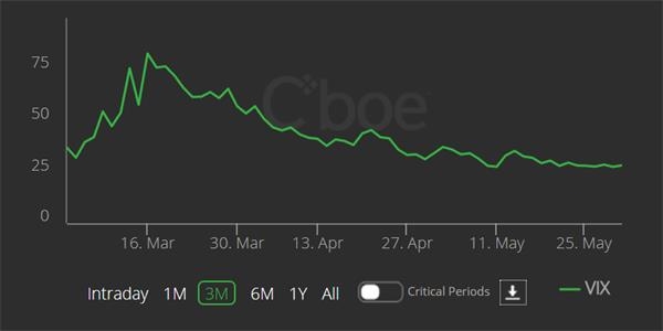 从芝商所官网我们得知,当前的VIX指数已经自3月的高位大幅下跌,如今徘徊在30下方,即平均水平附近,意味着波动性已经趋于正常化。