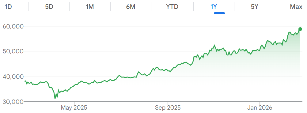 本周四,日本日经225指数盘中创下历史新高,史上首次突破59000点大关。