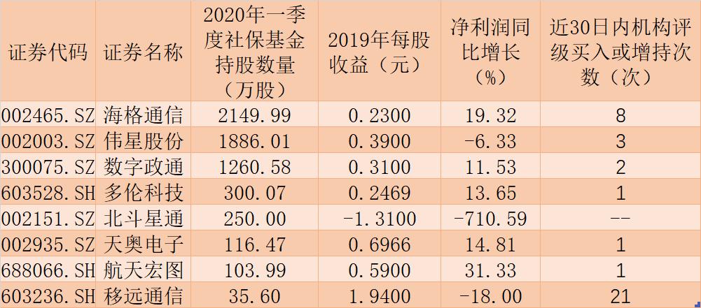 记者进一步统计发现,上述8只被社保基金持仓股中,移远通信(21次)、海格通信(8次)、伟星股份(3次)、数字政通(2次)、多伦科技(1次)、天奥电子(1次)和航天宏图(1次)等7只概念股近30日内获得机构推荐,后市配置机会优势显著。