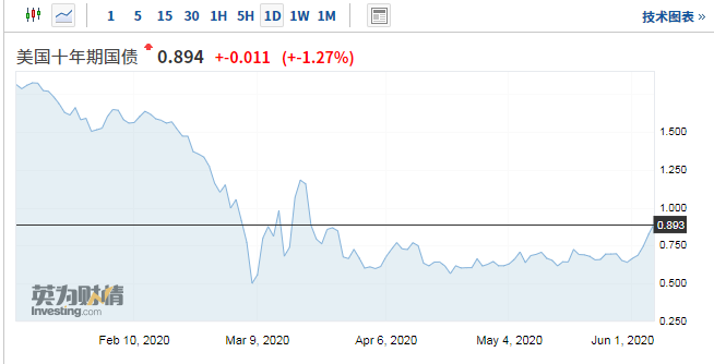 美债市场也反映出乐观情绪。基准10年期美国国债收益率已升至3月下旬以来的最高水平,逼近0.9%,收益率曲线正在变陡,通常这预示着经济恶化和衰退的风险正在大幅下降。受美联储零利率政策影响,各期限美债收益率4月以来持续低位运行,同时美联储通过各项工具买入国债向市场注入流动性平抑波动。