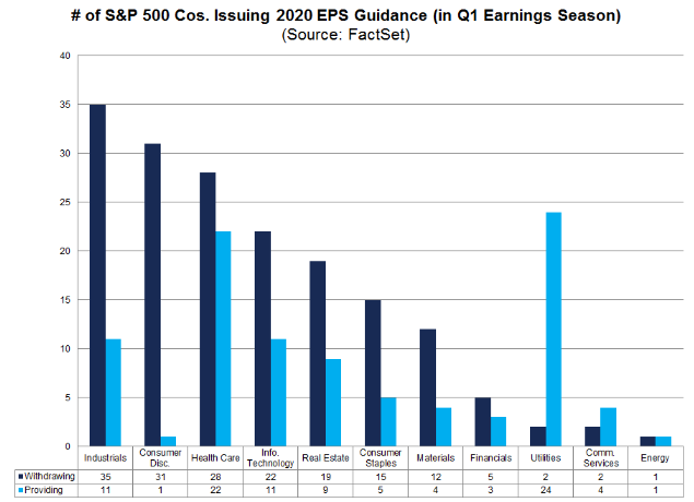 FactSet对标准普尔500指数成份股公司第一季度财报和电话会议记录的统计显示,有267家(56%)对本年度的每股收益指引发表了评论,其中172家公司(64%)表示,它们撤回了之前的2020财年指引,并将疫情未来影响的不确定性作为撤回全年每股收益指导的原因。