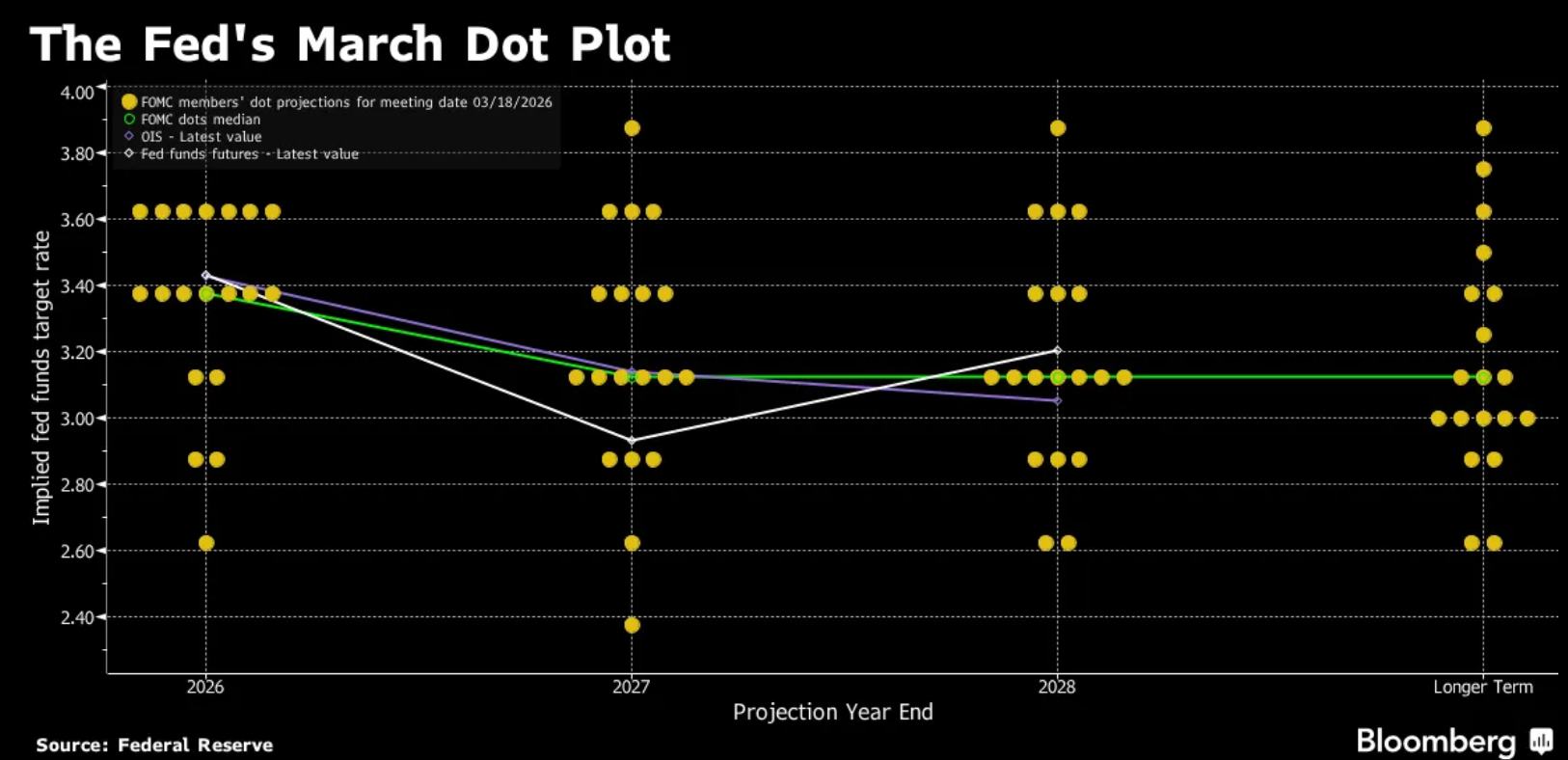 北京时间周四凌晨,美联储最新公布的货币政策决议显示,美联储如金融市场所预期的那样连续两次会议暂停降息,会议声明中,美联储新增中东地缘政治局势对美国经济影响不确定的表述,失业率从显示一些企稳迹象改称“基本保持不变”。市场重点聚焦的利率点阵图显示,美联储政策制定者们的利率展望路径和上一次于去年12月公布的点阵图时基本一致,依然预计2026年仅出现一次25个基点幅度的降息,预计明年也只降息一次。