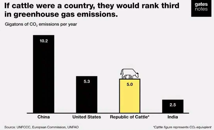 盖茨基金会此前曾做过一个有趣的对比,如果把全世界所有的牛当做一个国家,那么其碳排放量将仅次于中国和美国。