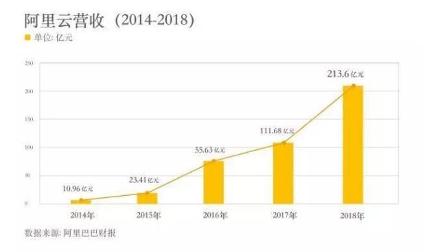 比如上述提到的阿里云,除了2019年成绩单,过去4年的业绩依旧十分出色。2018自然年阿里云营收规模达到213.6亿元,4年增长了约20倍,一举成为亚洲最大云服务公司。