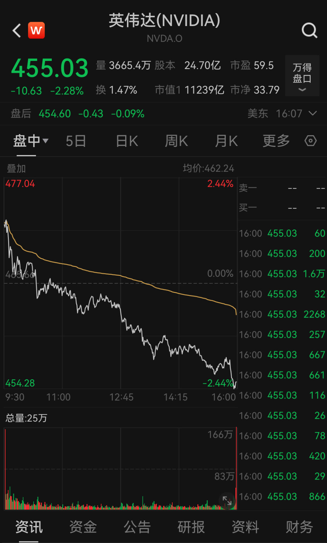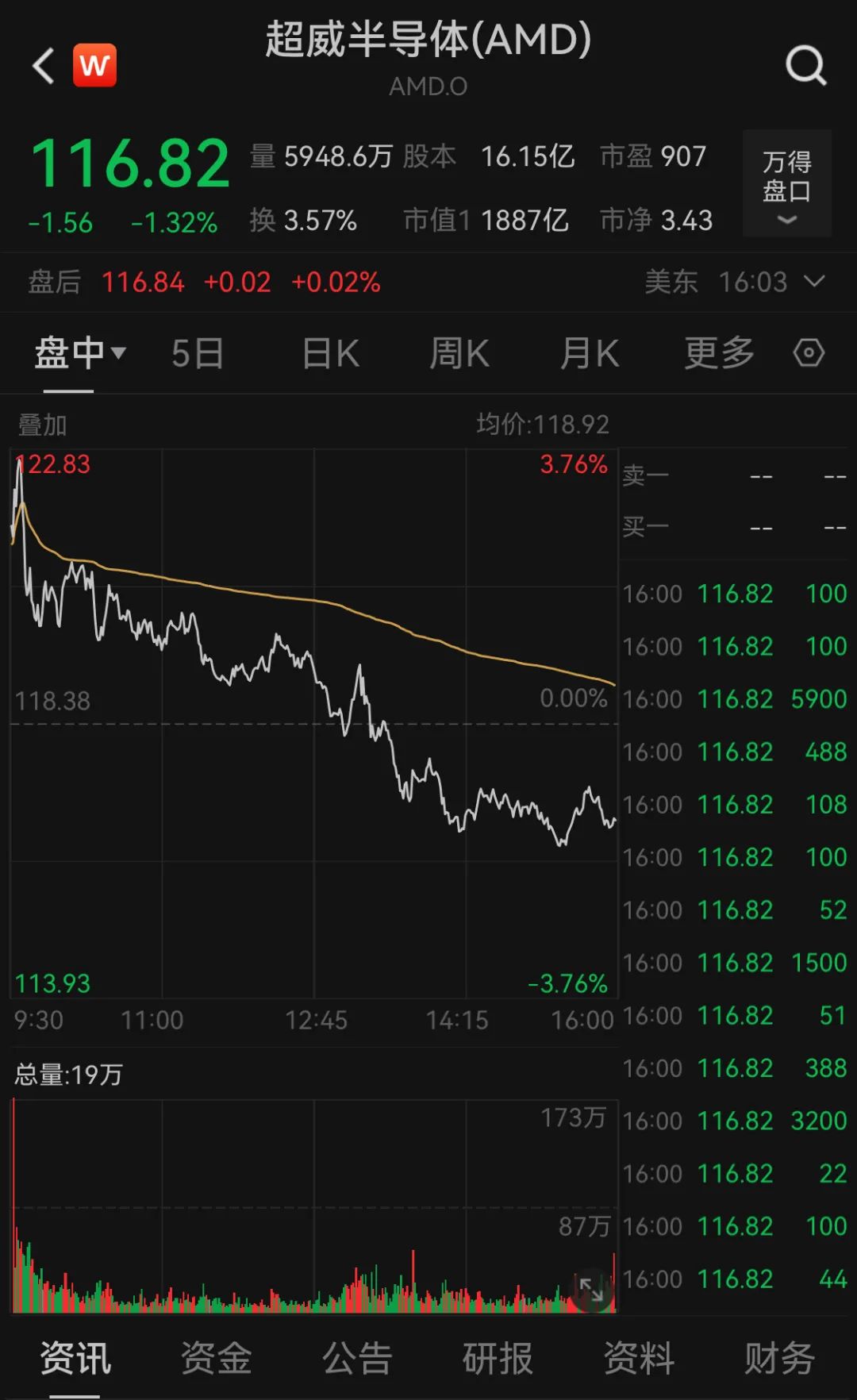 盘面上,AMD股价开盘后迅速拉涨超3%,然而随后开始下跌。截至当地时间12月6日美股收盘,AMD收跌1.32%,报116.82美元/股,总市值1887亿美元。英伟达收跌2.28%,报455.03美元/股,总市值11239亿美元。