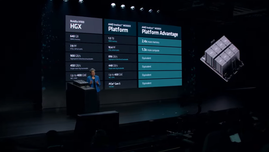 此次发布,苏姿丰将该新品大方对标英伟达H100 HGX GPU加速器。据了解,H100 HGX GPU是英伟达在2022年3月推出的面向数据中心的人工智能GPU,基于Hopper架构并具备800亿晶体管。苏姿丰表示,在实际用于推理工作时,单台服务器配置了八个MI300X加速器,其性能比英伟达H100 HGX快1.4到1.6倍。该服务器平台在培训性能上与竞争对手表现相当,在推理性能上表现出显著优越性。此外,升级的内存容量和带宽使客户能够运行更多AI模型,或在同一服务器上运行更大的模型。